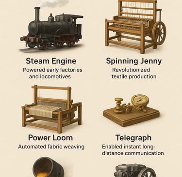 The Industrial Revolution was not simply a time of new technology—it was a turning point that redefined every element of culture. What the preceding chapter outlined in depth are 6 inventions that crucially shaped productivity and power over the 19th and 20th centuries and were crucial to this evolution: the steam engine, Spinning Jenny, power loom, telegraph, Bessemer process, and internal combustion engine. They shattered barriers of what had been considered feasible and enabled the development of the modern city, international commerce, and so on. They affected the way people worked, communicated, and traveled, and laid the groundwork for the comforts and opportunities we have today.