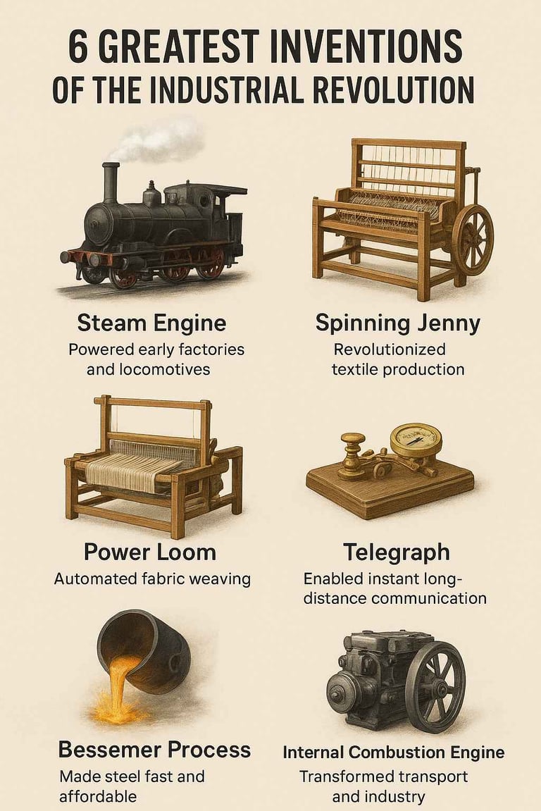 Discover the six greatest inventions of the Industrial Revolution and how these groundbreaking Industrial Revolution inventions transformed society, industry, and technology. Learn about the impact and legacy of the greatest inventions of the Industrial Revolution in this detailed, informative article.